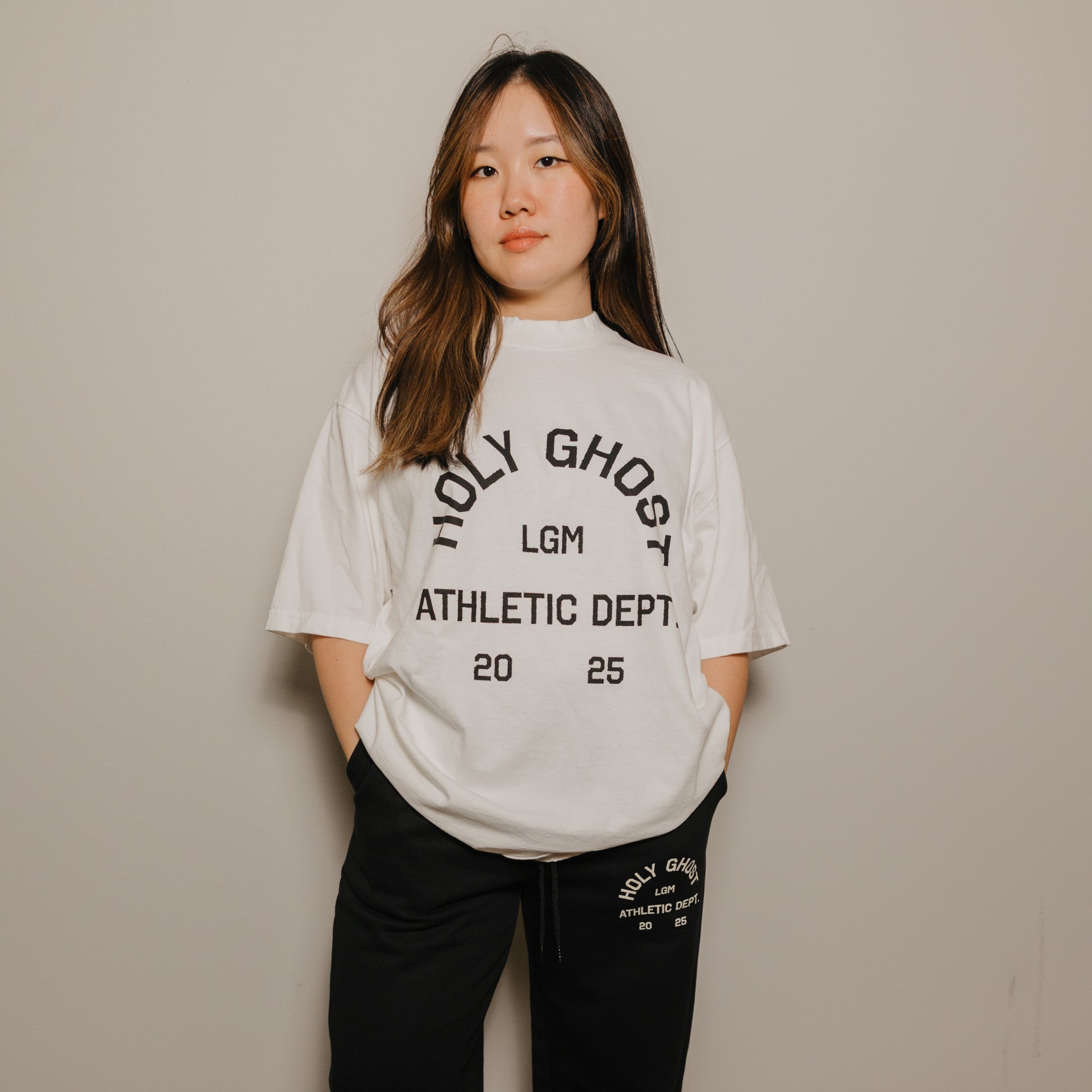 Short t-shirt with oversized boxy fit. Front reads "Holy Ghost Athletic Dept." in black print. Made of mid-weight 100% cotton.