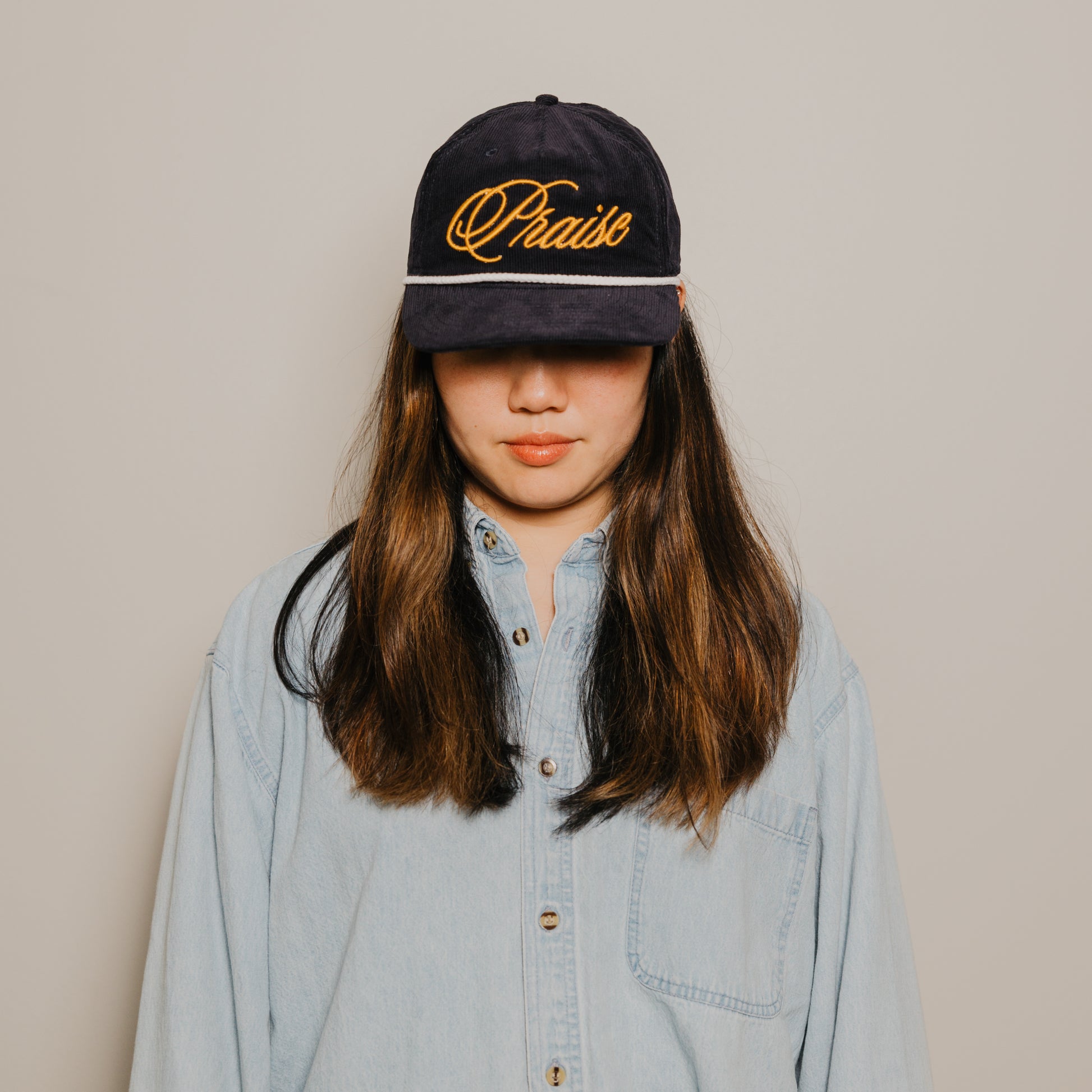 Navy unisex corduroy cap with "Praise" embroidered on the front. Features an adjustable back closure.